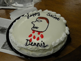 Just to be clear, she sent me the picture, not the cake. Said cake was made for her birthday, which happens to coincide with the Feast of St. Denis, he of headache-curing and preaching-whilst-decapitated fame. She learned of this august coincidence here, of all places. A little knowledge really is a dangerous thing.