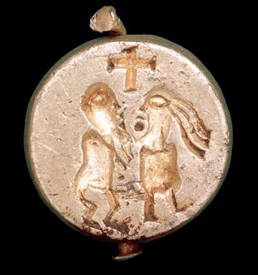 That’s the back side of Bathild’s personal seal, found in 1999 by one of those clever metal detectorists. According to the experts, the image is of Bathild and some dude, presumably Clovis, getting all naked and freaky.* The theory is that this seal would’ve been worn on a ring and used to seal private letters, while the stodgy profile side (not pictured) would’ve been used to seal documents for public consumption.