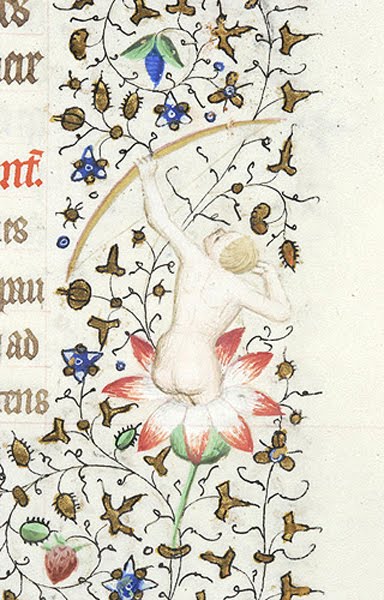 I don’t know much about Charlotte of Savoy, Louis XI of France’s* queen and the mother of Charles VIII.** But the Pierpont Morgan library owns a book of hours commissioned for her, and man she sure did enjoy a side order of naked people with her daily devotionals. Oh, the naked people in these margins! So many of them! And so often… growing out of flowers for some reason. Like so:
